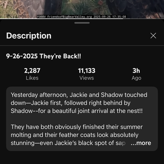They have life long mates, and this pair—Shadoe and Jackie—who’s territory is at Big Bear Lake in Southern California, near my old home, has a massive following on YouTube from the camera on their huge nest and photo posts from the wild life rangers and volunteers down there.
